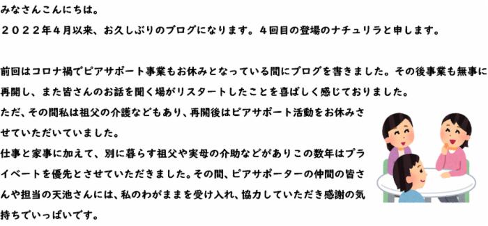 4回目の登場となりましたピアサポーターのナチュリラと申します。