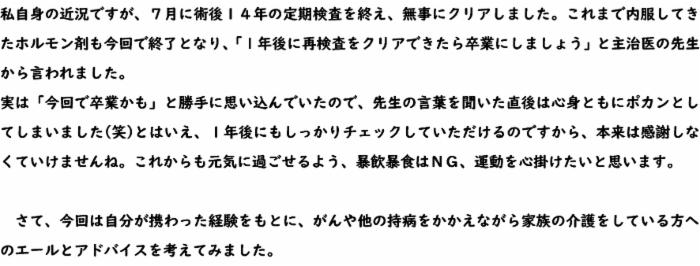 医学の進歩と、がんになってからの年数がずいぶん経っていることに気づかされました。