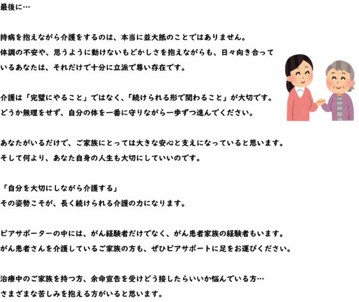 自分自身ががん患者になり、がん患者をもつ家族という立場になったことで気づいたことがあります。それは何気なく口にする『頑張れ!』や『大丈夫よ!』という言葉を使う難しさです。個人的には大丈夫という言葉は大好きで、前向きになれ、安心につながる言葉だと感じるのですが…