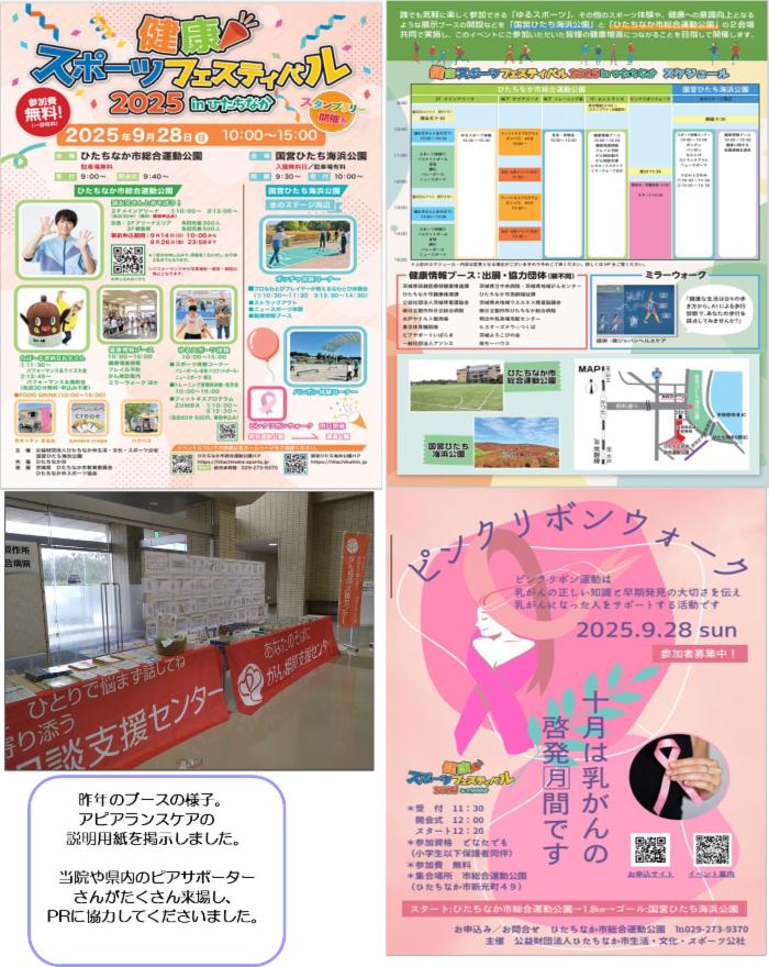 9月28日(日)、ひたちなか市総合体育館でスポーツ健康フェスティバルが開催されます。今年もひたちなか総合病院のがん相談員や当院のがん薬物療法看護特定認定看護師と一緒にブースを出展します。よろしければお立ち寄りください。