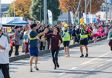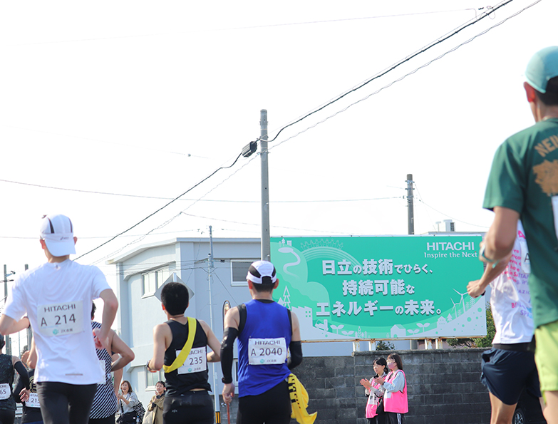 高橋尚子さん、猫ひろしさん、マラソンYouTuberのこわだ君さん、まかランさんがゲストランナーとして参加。ハイタッチや伴走、掛け声で市民ランナーを鼓舞し、沿道の応援にも笑顔で応えるなど、大会全体を明るく盛り上げました。街頭では「創業の地 日立市でのブランディングキャンペーン」で掲載しているロードサインがランナーたちを見守ります。日立市ならではの景観を楽しめるコースを3,975名が見事に完走しました。