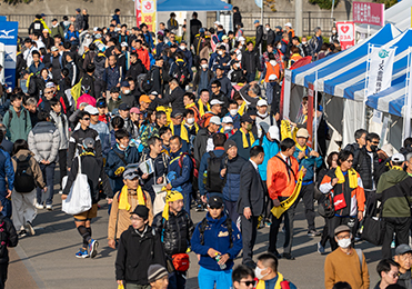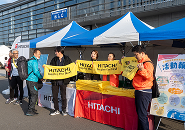 日立製作所は、発着点の市民運動公園に企業ブースを設置し、タオルやトートバックなどのノベルティを配布しながらランナーたちの到着を待ちました。