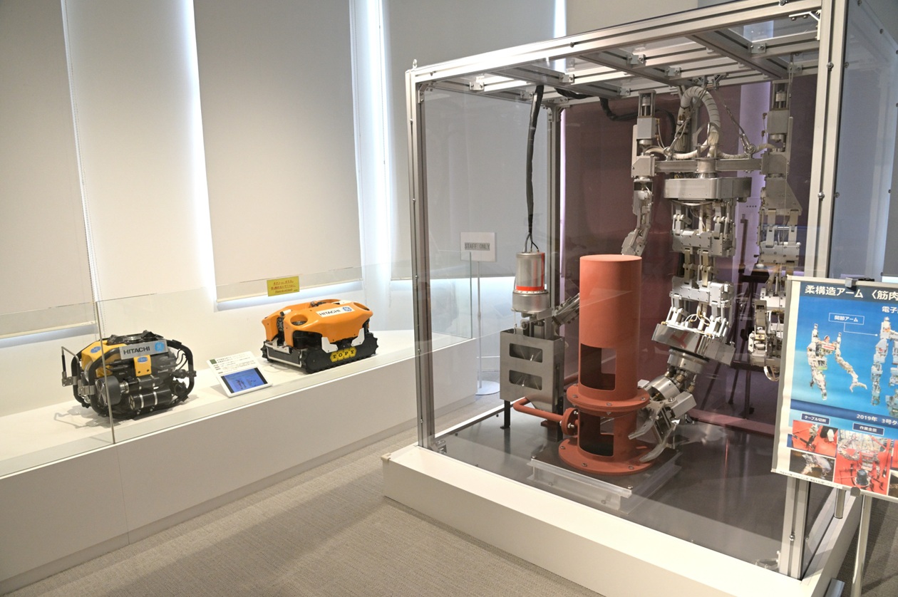 廃炉資料館では、燃料デブリの調査に用いられた日立の水中遊泳ロボットや水中歩行ロボットなども展示されている