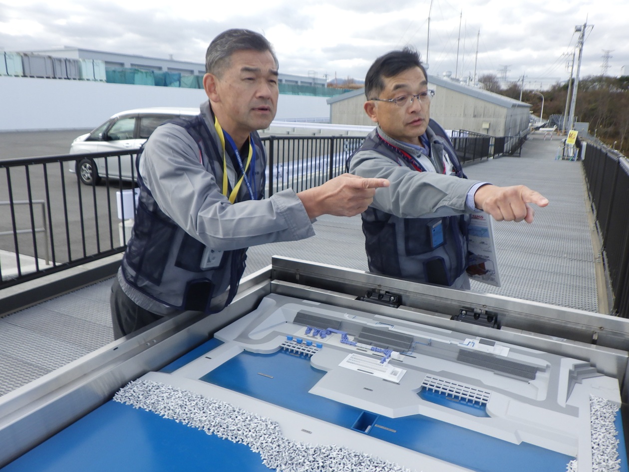 ALPS処理水希釈放出設備が見渡せるグリーンデッキには設備の模型も設置されている