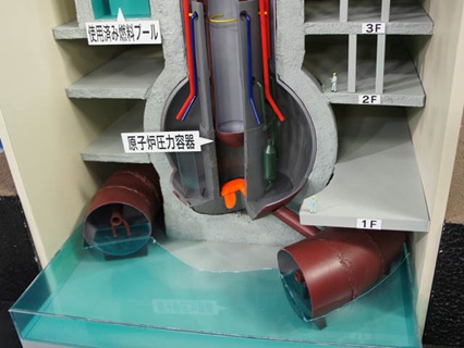 2011年当時、松井氏がニュース番組での解説のために自宅で自作した福島第一原子力発電所1号機の1/144スケールの模型。ペデスタル部分のカットモデルで汚染水が溜まっている様子を再現し、溶け落ちた燃料が格納容器底部を浸食している様子もわかる工夫がされている