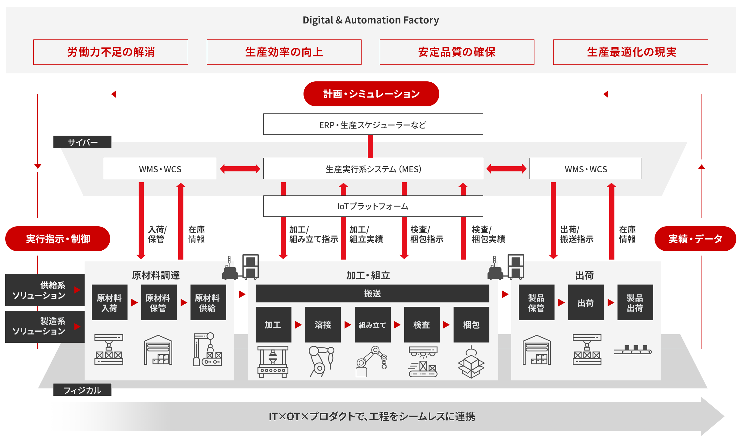 物理的な自動化はもちろん、指示の割当や製造ラインバランスの制御、トレーサビリティなども一体で策定・検討することで高効率な製造ライン運用やラインの全体最適を実現します。