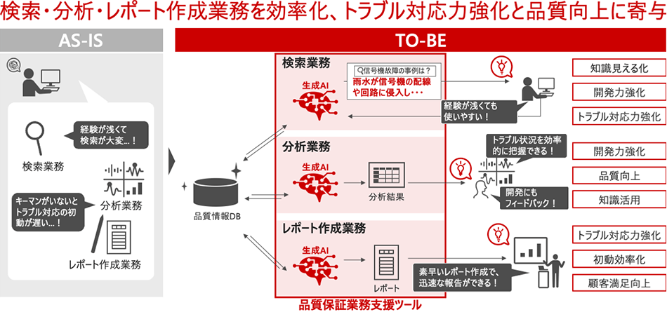 本取り組みでは、膨大な過去事例などが蓄積されたデータベースから情報を検索可能な「品質保証業務支援ツール」にAIエージェントを適用。熟練者がどのようなキーワードや順番で情報を探索しているのかというパターンや業務プロセスなどの暗黙知の形式知化を推進し、2024年10月から2025年3月まで実証実験を行いながら、現場で活用できるレベルへと精度を向上。担当者の経験値に関わらず、誰でも適切な類似事例を抽出することができ、さまざまな問い合わせに対して、精度の高い回答を短時間で作成することが可能になった。鉄道システムの品質保証業務における実証においては、問い合わせへの回答に必要な情報を検索する時間を約9割削減でき、お客さまへの対応力強化として高い成果を得ている。また、改造作業レビューでの適用による類似トラブルの防止、分析業務やレポート作成業務の効率化を実現することで、ライフサイクル全体にわたって情報制御システムの品質向上に貢献する。
