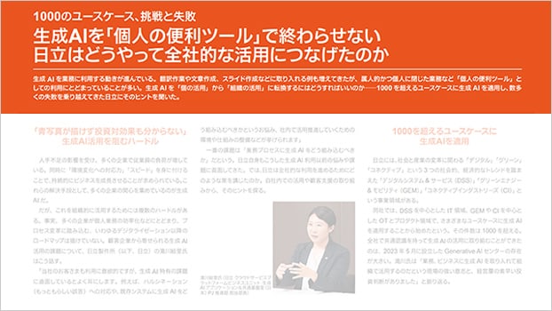 生成AI を「個の活用」から「組織の活用」に転換するにはどうすればいいのか――1000 を超えるユースケースに生成AIを適用し、数多くの失敗を乗り越えてきた日立の事例をご紹介します。