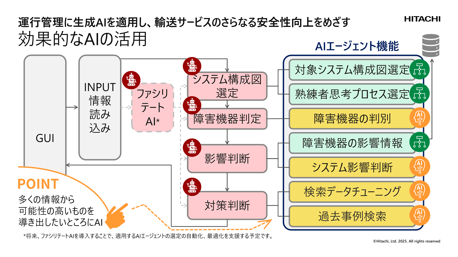 2025年の「鉄道技術展」で日立が展示した「鉄道運行管理システムへのAI活用」は、これらの課題を解決するために作られたAIエージェントだ。AIエージェント処理の信頼性を支える学習データには、日立が自社事業のノウハウとして蓄積する情報も使っている。日立内の過去の障害対応履歴、日立独自のプロセスでデータ化した熟練者の暗黙知などを基に、AIエージェント、RAG(検索拡張生成)を約半年で作り上げた。田村氏は「障害対応履歴や障害報告書に記されていない“熟練者の暗黙知”はエスノグラファー(観察調査のスペシャリスト)によるインタビューの手法を使い、熟練者から聞き取った内容をAIエージェントが活用できるデータに変換することで補いました」と説明する。