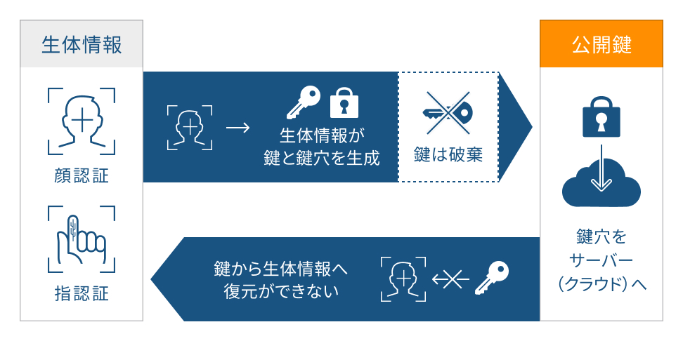 生体認証技術と公開鍵暗号(PKI:Public Key Infrastructure)を組み合わせることで、「生体情報そのものをどこにも保存しない」方式で、安全かつ利便性の高い認証を実現します。