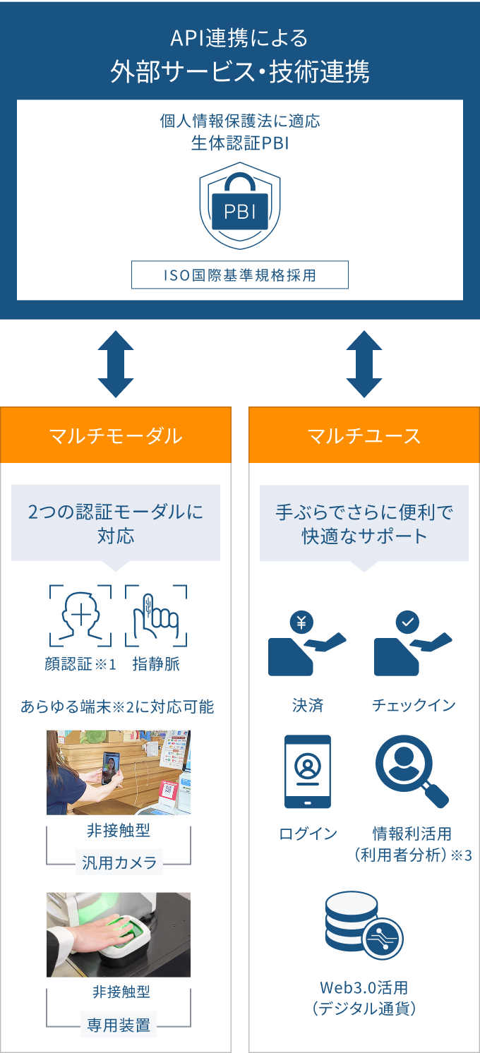 2つの認証方法(指静脈・顔)に対応し、利用環境に合わせて最適な方法の選択、また自由に組み合わせることが可能です。さらに、登録した生体情報は、決済や入退室、ログイン、デジタルウォレットなどさまざまな用途や場面で共通して利用できるため、利便性とセキュリティを両立します。